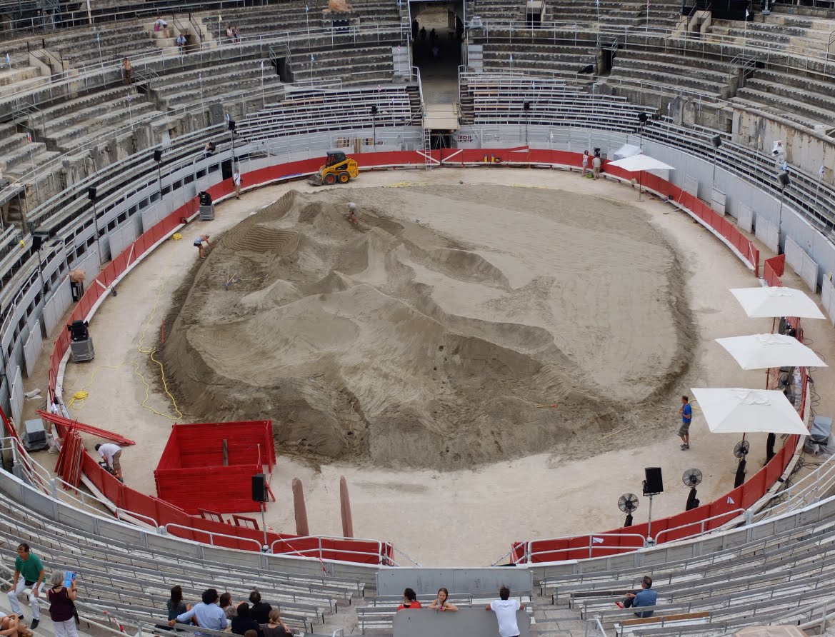 This unusual exhibition offers a foretaste of the future programme of the new centre for production and exhibition dedicated to contemporary culture that the LUMA Foundation will build at the Parc des Ateliers in Arles. This connection is also manifested in the re-use of the sand brought into Arles to create this shifting landscape. After the exhibition, all the sand will be moved to the Parc des Ateliers, where it will be accessible to the general public as part of a temporary playground before being re-used once again in the foundations for the building designed by Frank Gehry.